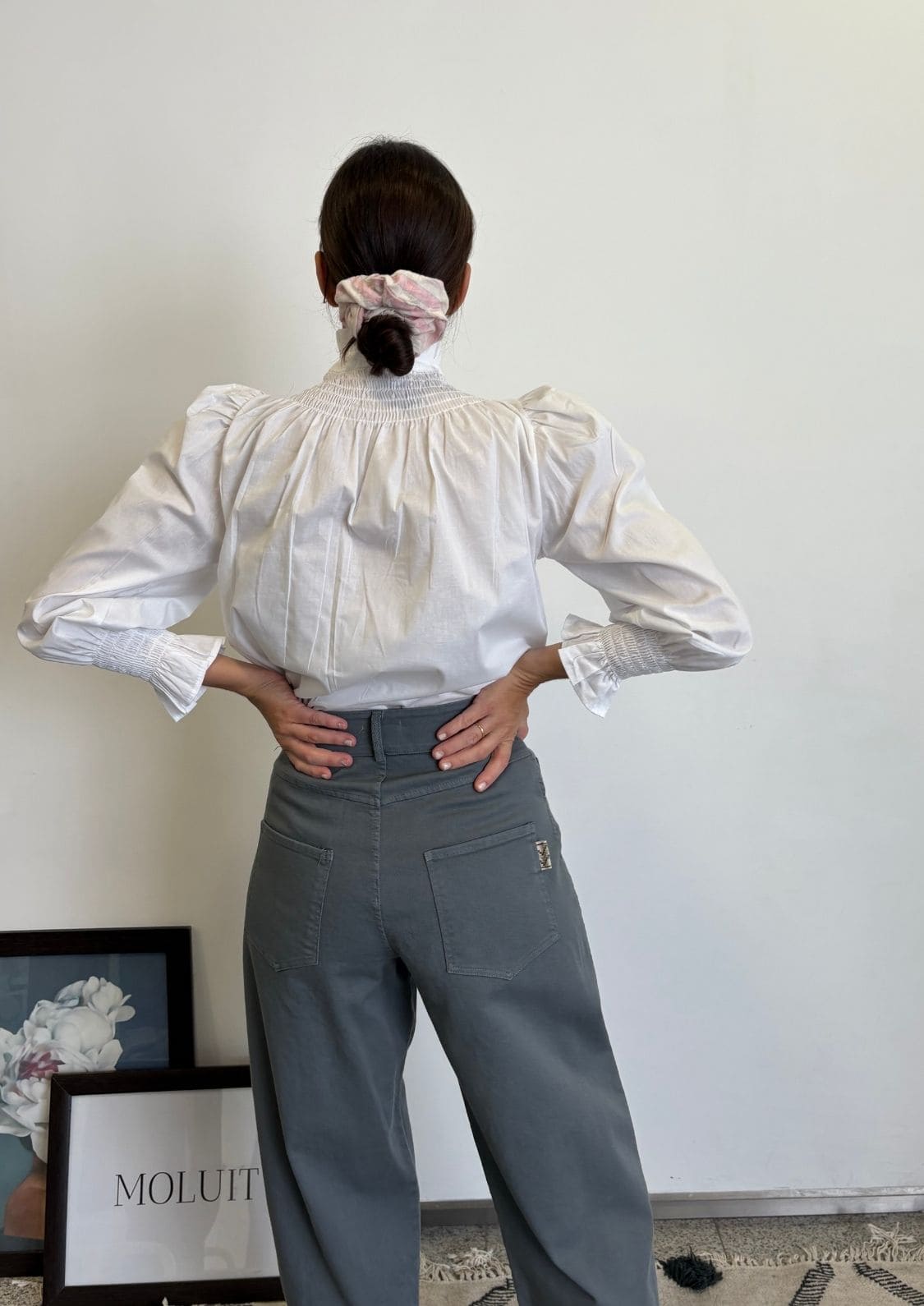 Blusa de manga larga en color blanco. Cerrada con botones en la parte delantera, destaca por su cuello alto con detalles en nido de abeja, mangas ligeramente abullonadas que terminan en puños fruncidos con volantes.