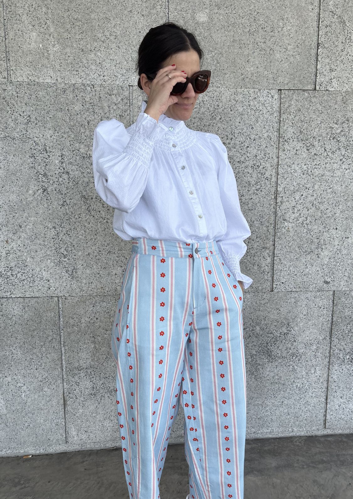 Blusa de manga larga en color blanco en tela tejida con textura. Cerrada con botones en la parte delantera, destaca por su cuello alto con detalles en nido de abeja, mangas ligeramente abullonadas que terminan en puños fruncidos con volantes.