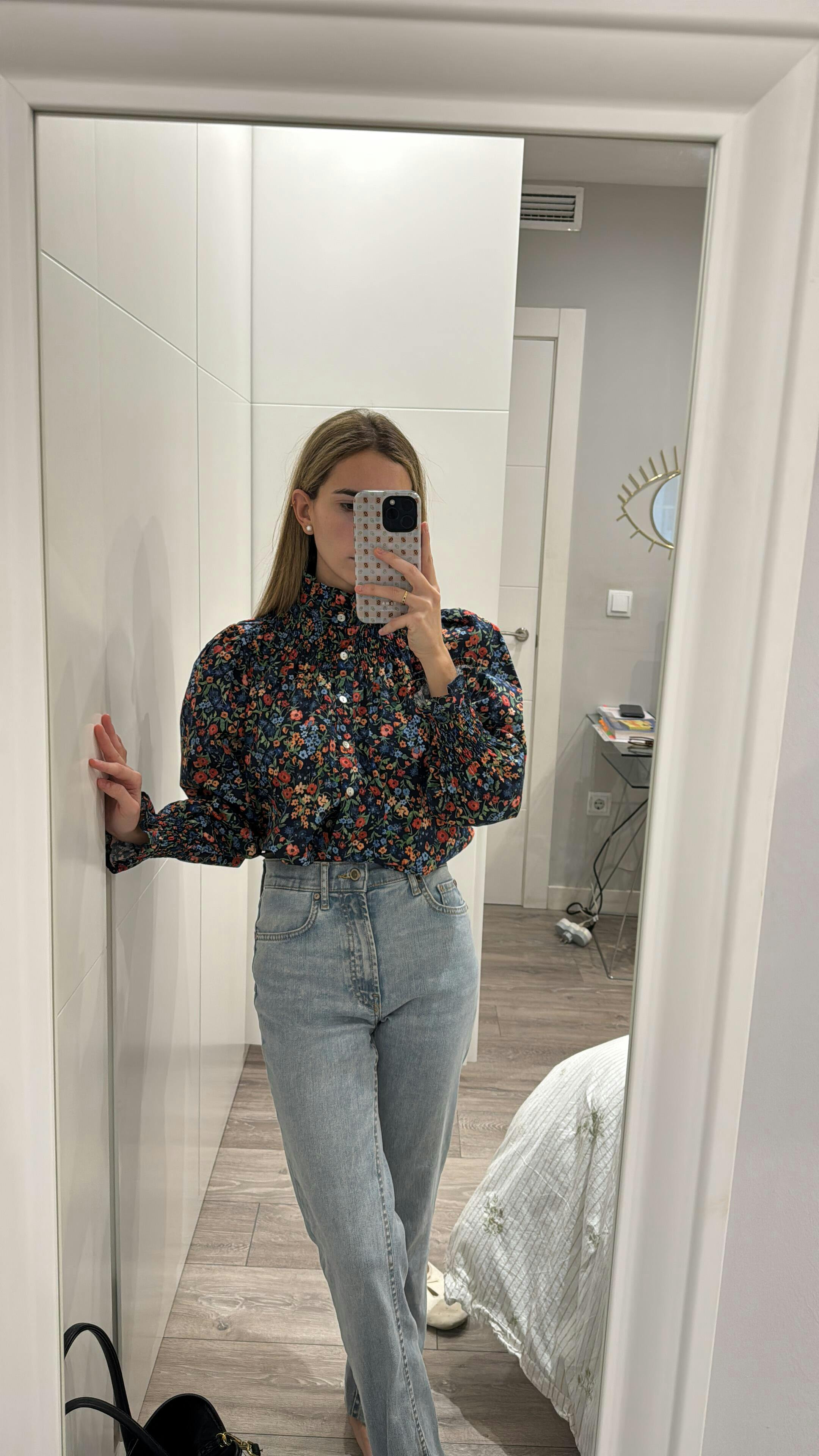 Blusa de manga larga con estampado floral diseñado por Eugeniota. Cerrada con botones en la parte delantera, destaca por su cuello alto con detalles en nido de abeja, mangas ligeramente abullonadas que terminan en puños fruncidos con volantes.