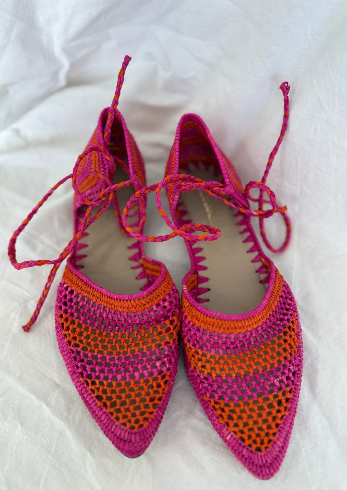 Merceditas de mujer en color fucsia con rayas naranjas. Fabricadas en rafia natural y cuero.