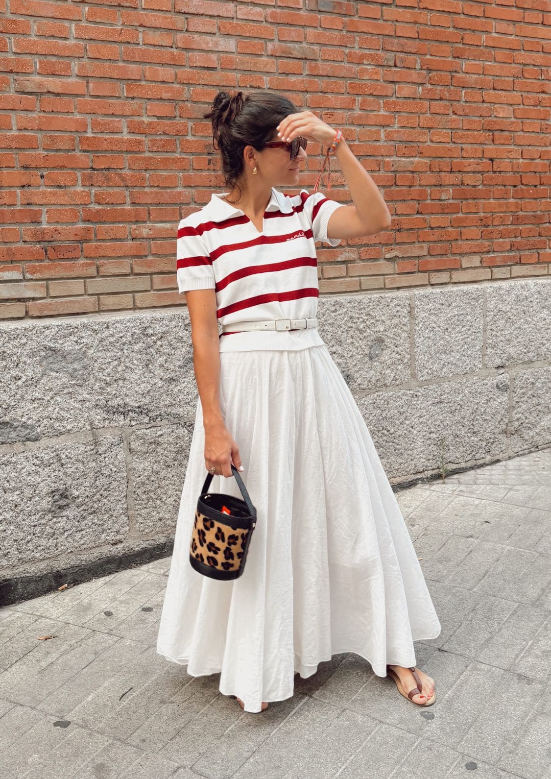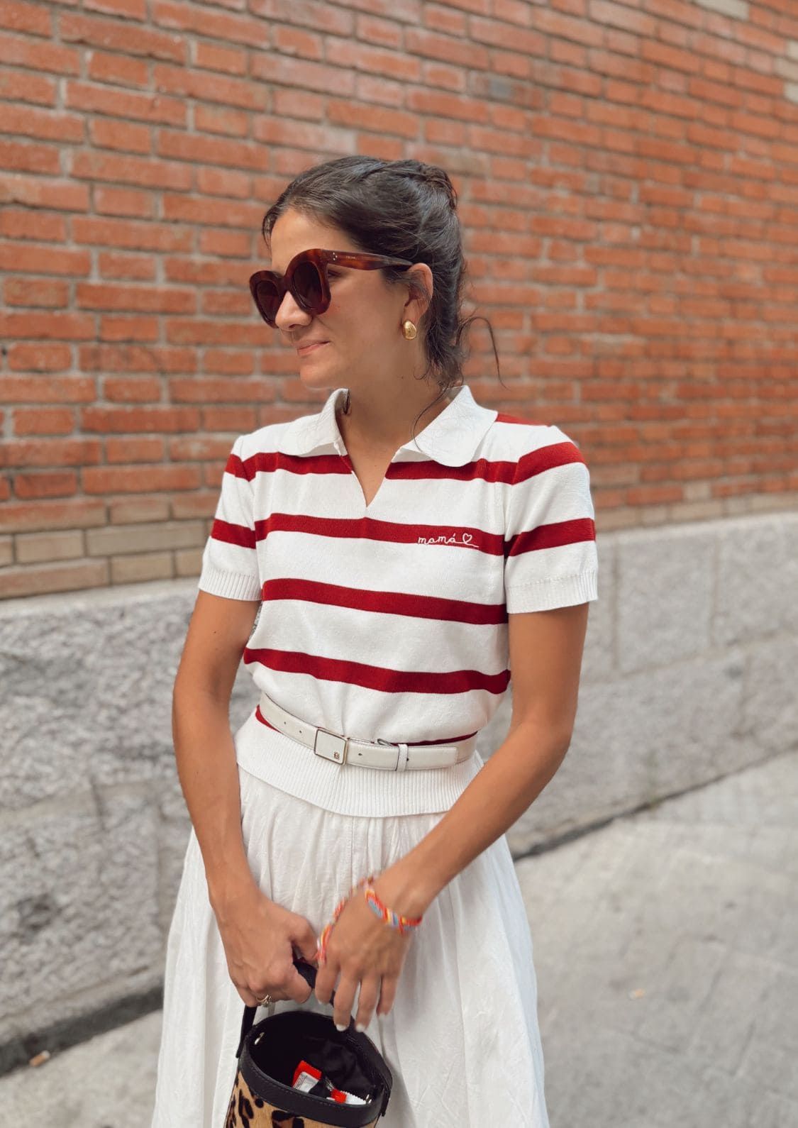 De inspiración retro y corazón moderno, este polo de punto combina rayas burdeos sobre fondo crudo con cuello clásico y corte favorecedor. Confeccionado en un tejido ligero, suave y ligeramente elástico, es ideal para esos días en los que quieres sentirte cómoda sin renunciar al estilo.