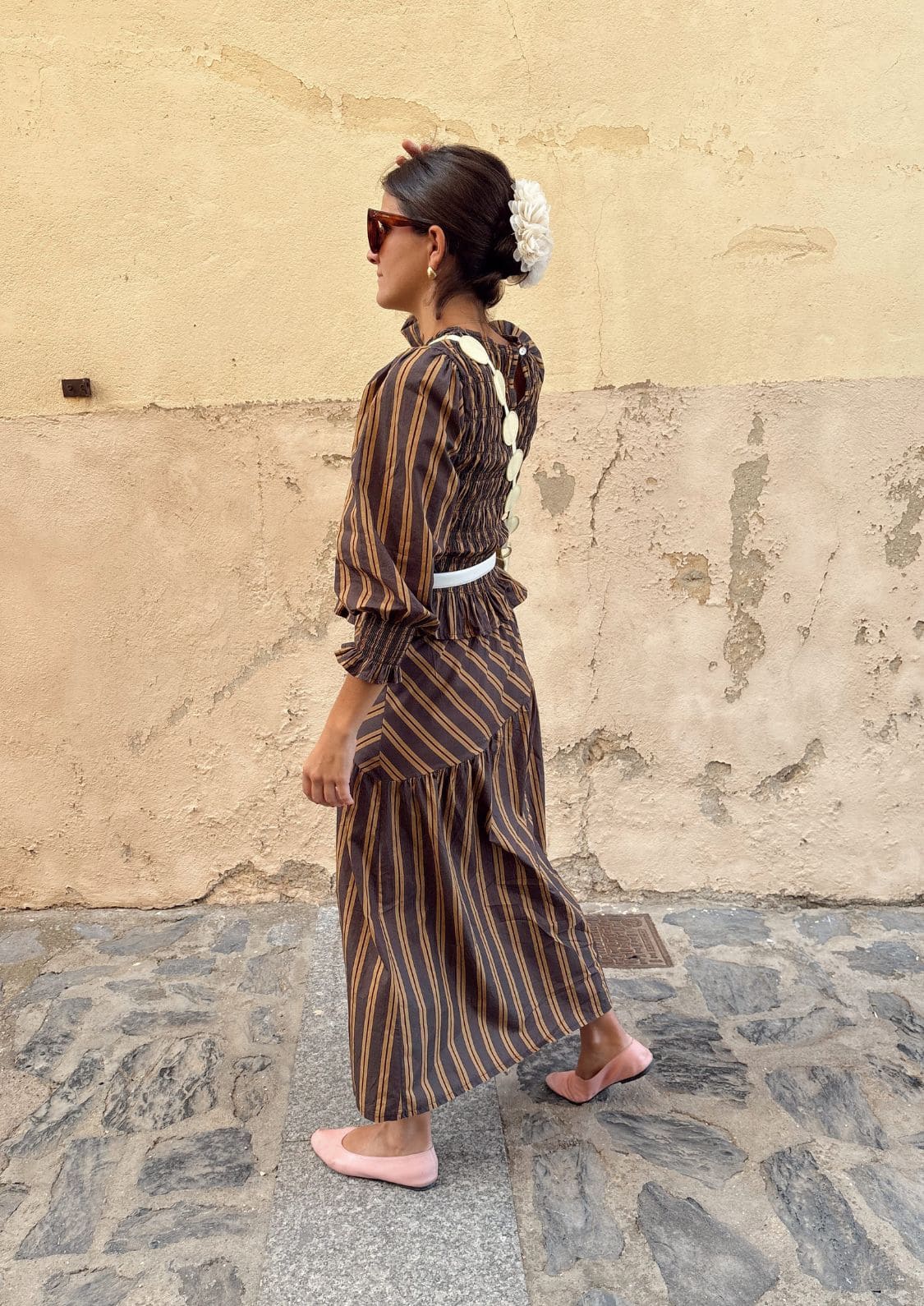 Una falda con movimiento y estilo propio. Diseñada en corte midi con vuelo asimétrico, su tejido ligero aporta fluidez a cada paso, mientras que el estampado de rayas en tonos chocolate y beige estiliza la silueta de manera natural.