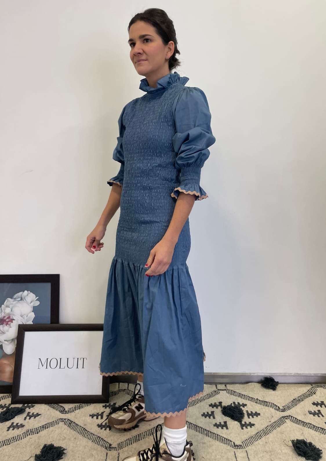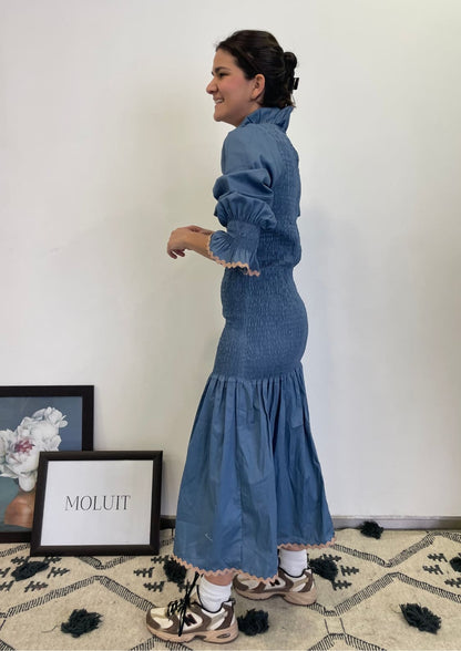 Vestido Capri en color azul es la combinación perfecta de feminidad y sofisticación. Su diseño destaca por un cuerpo de nido de abeja que se adapta a la silueta, resaltando la figura con un toque de elegancia. Las mangas abullonadas con fruncidos añaden un aire romántico, mientras que el cuello alto con volantes realza la delicadeza del diseño. La falda fluida con detalles ondulados de color negro en el bajo le aporta movimiento y un acabado sutilmente vintage.