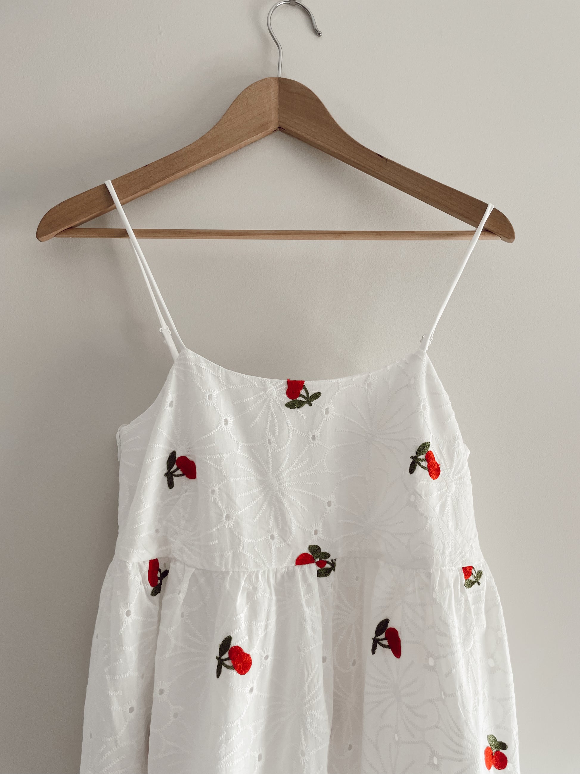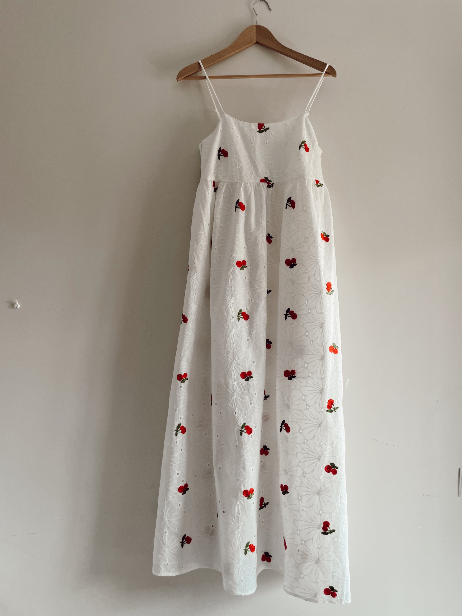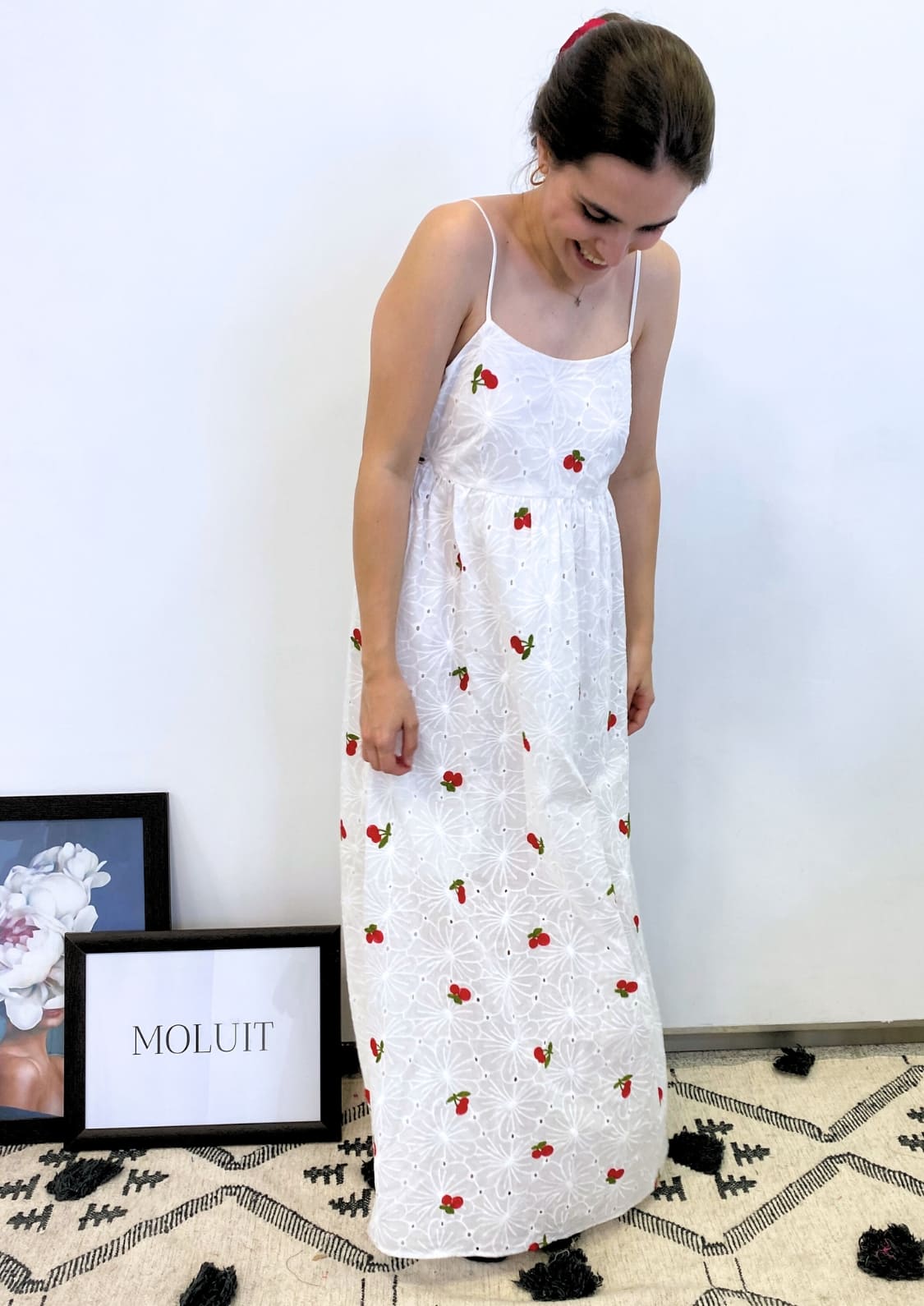 Vestido largo de algodón en color blanco con cerezas bordadas. Vestido de tirante fino, con corte debajo del pecho y forro hasta la rodilla.