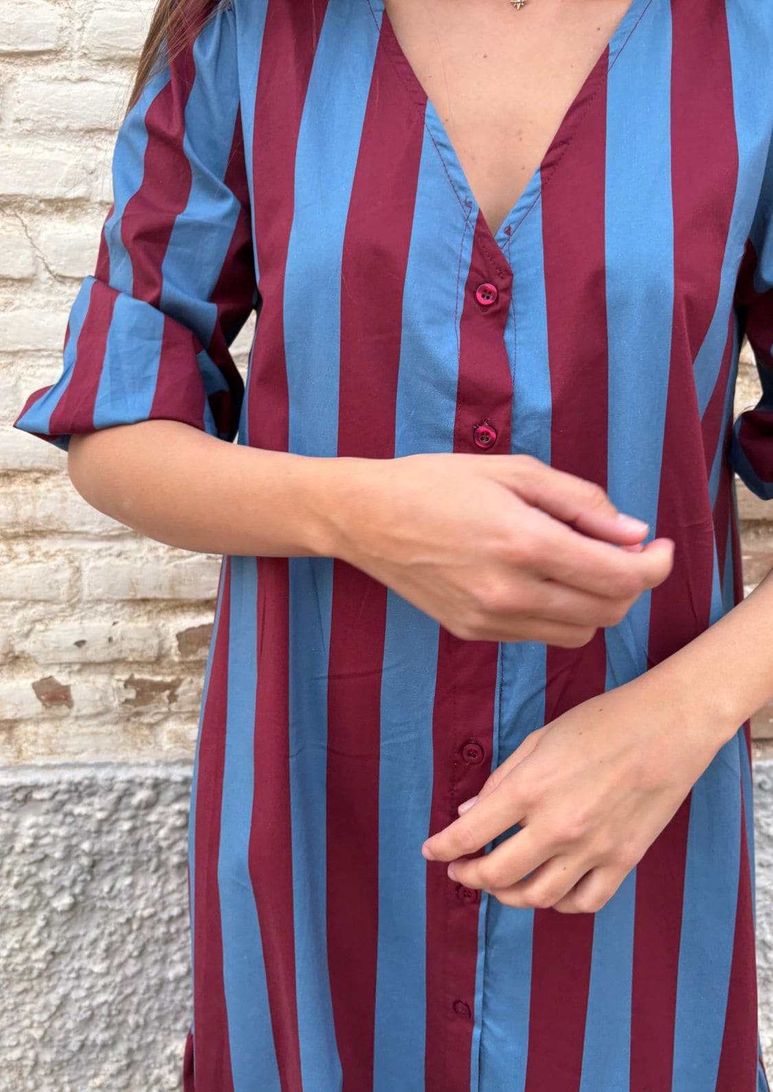 Confeccionado en tejido ligero y fresco, su estampado de rayas verticales en tonos azul y burdeos alarga visualmente la figura. El detalle del volante en el bajo añade movimiento y un toque desenfadado que lo convierte en una prenda versátil, perfecta tanto para el día a día como para ocasiones especiales.